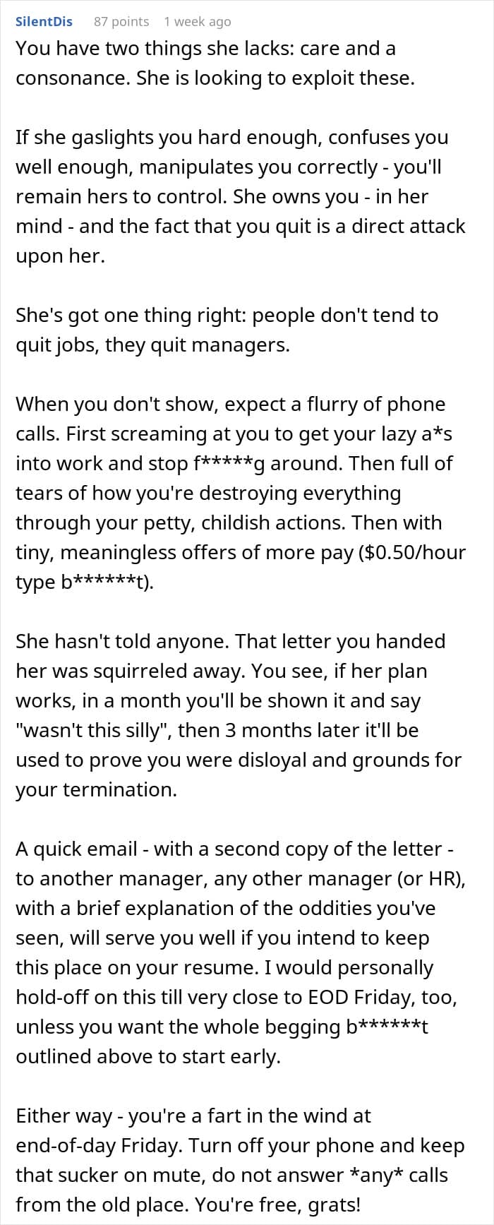 Eventually, the poster’s boss came to terms with the fact that he was leaving and begrudgingly spoke to him about it. All of this must have certainly proved to him that he had made the right decision to leave the company.