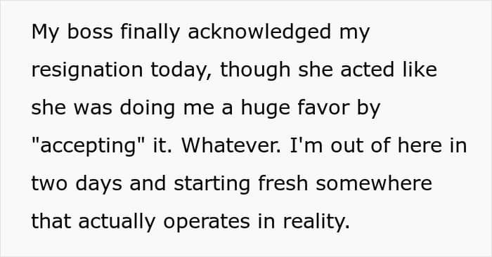 Text showing employee frustration as boss pretending never gave notice, finally acknowledging resignation with reluctance.