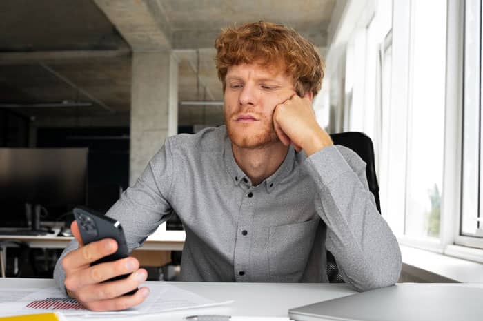 Young man in a gray shirt looking frustrated at his phone, possibly dealing with a boss pretending never gave notice situation.