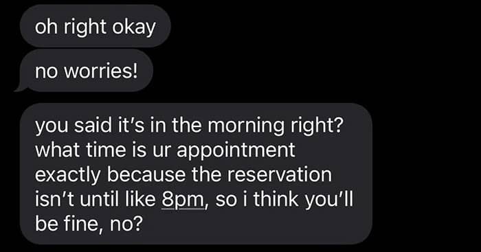 Text messages discussing a friend’s birthday and conflicting appointment.
