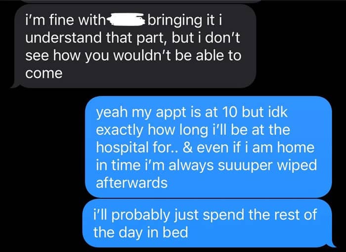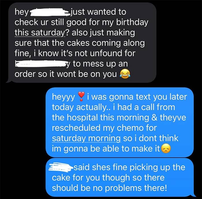Text exchange discussing chemo appointment and missing a birthday event.