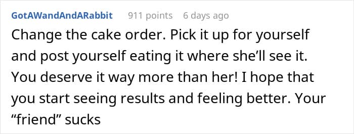 Reddit comment discussing birthday plans and chemo excuse, suggesting to eat cake alone and feel better.