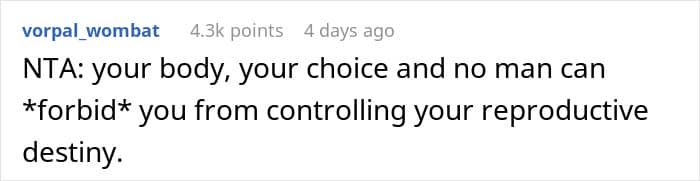 Comment on sterilization, “Your body your choice NTA,” with 3.2k points, 4 days ago.