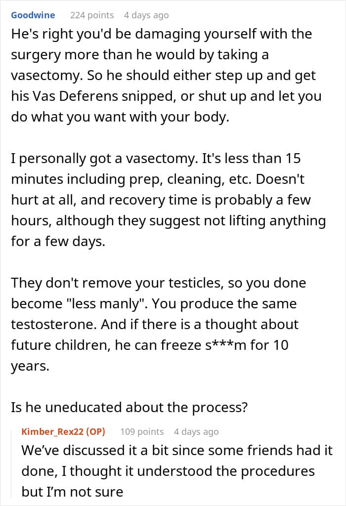 Reddit discussion on sterilization choices and partner disagreements.