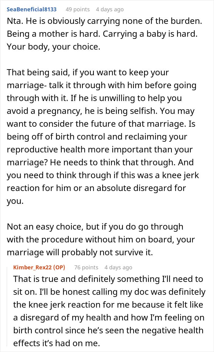 Discussion about sterilization decision against partner’s wishes, featuring user comments on birth control choices.