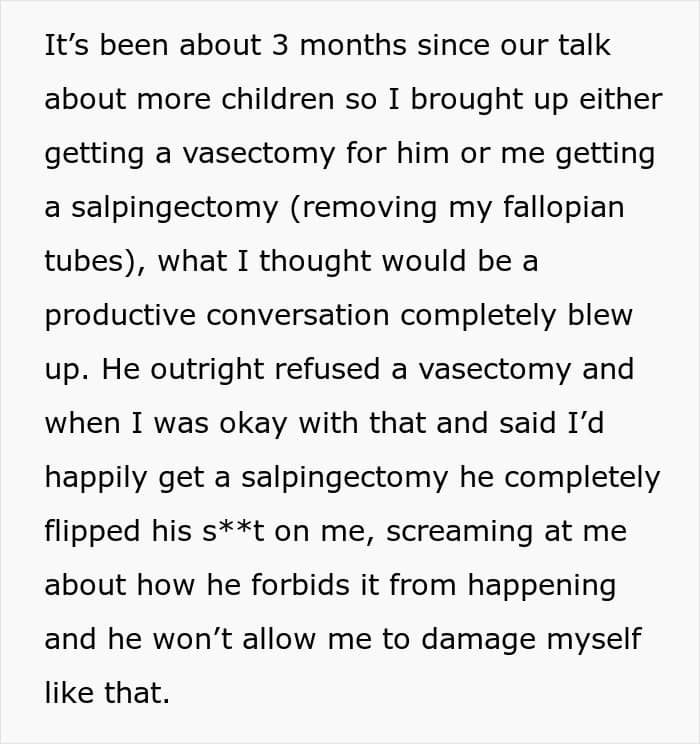 Since this woman had debilitating reactions to birth control and didn’t trust other methods, she thought that sterilization (either for her or her husband) would be perfect for their family. What she didn’t expect was that her husband would strongly object, forbidding her from going through with it.