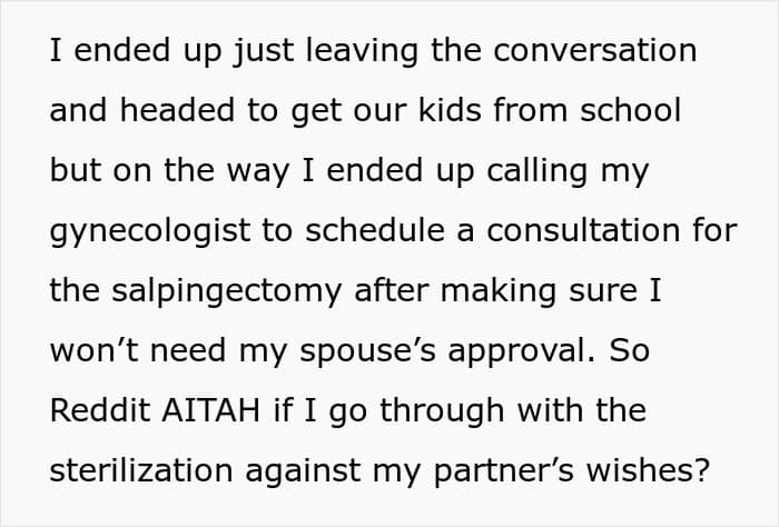 Text about sterilization decision against partner’s wishes, discussing scheduling a gynecologist consultation.