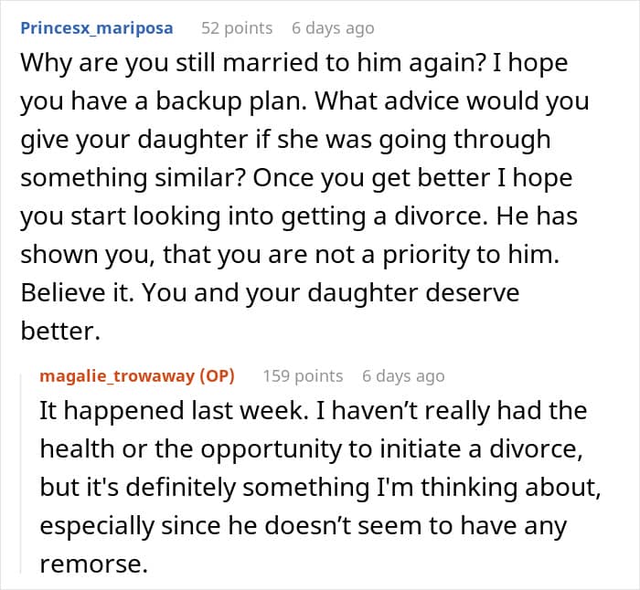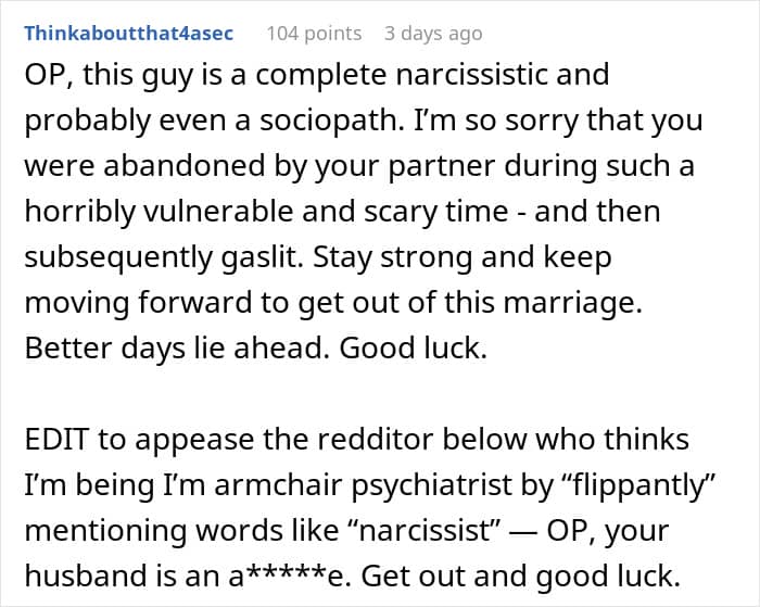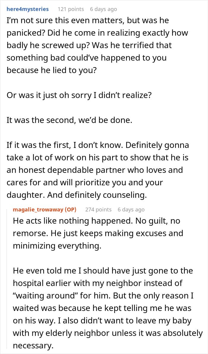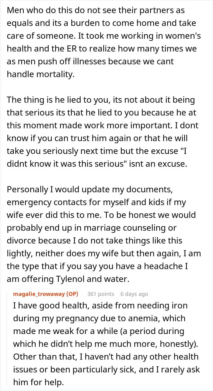Reddit comment discussing husband not rushing home after wife’s SOS call during hospital visit.