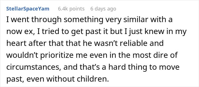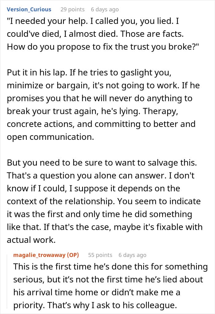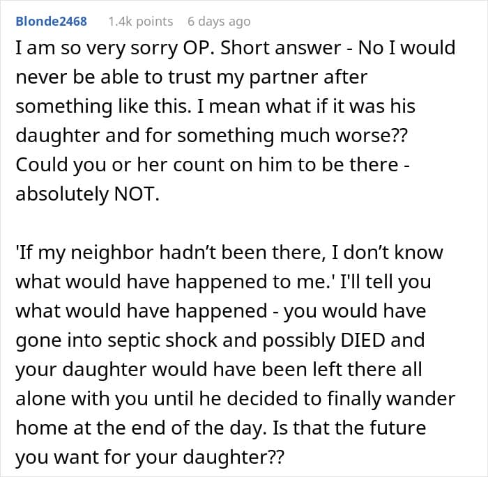Reddit comment discussing a husband not rushing home after wife’s SOS call, impacting their marriage.