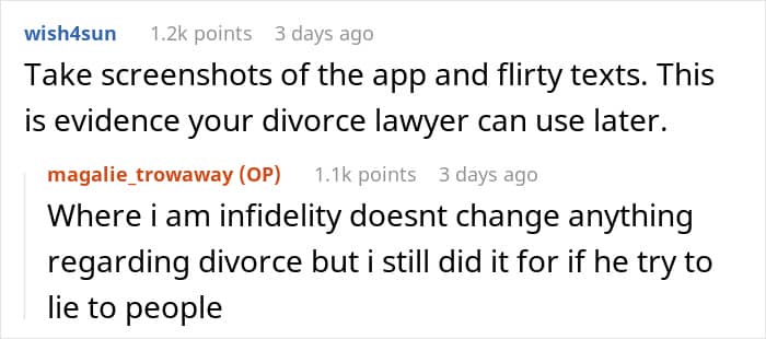Reddit comments discussing infidelity and evidence for a divorce lawyer.