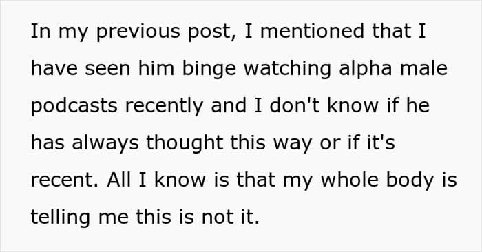 The author shared how her long-term boyfriend’s behavior radically changed after he started binge-watching so-called alpha male podcasts, which often promote toxic rather than healthy masculinity. Suddenly, he decided that he wanted to be the man of the house and to make all of the decisions at home, once he and the OP got married.