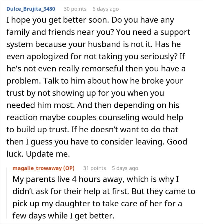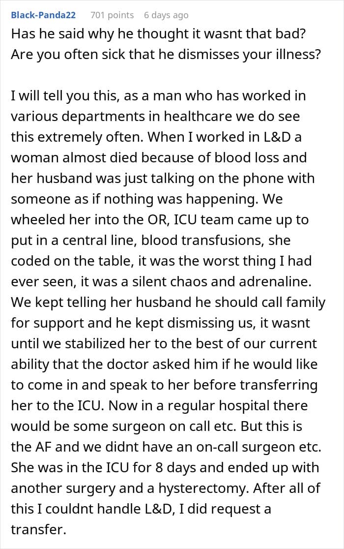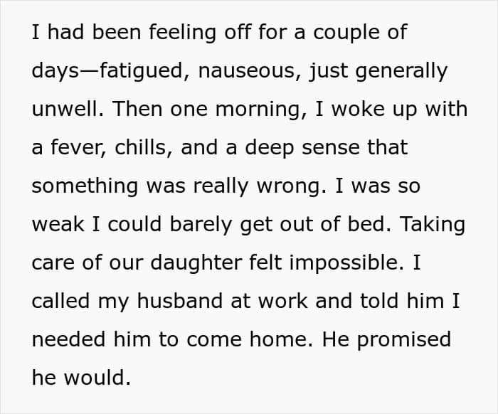 For this redditor it was her husband who showed her that she could not trust him the way she thought she could. After waking up feeling terrible one morning, she asked him to come home from work as soon as possible, but instead, he took his time and even lied to his wife during the difficult moment.