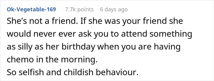 But a healthy friendship must go both ways. It’s not fair for the woman described in this story to expect her friend to drop everything for her birthday, while she refuses to show any empathy towards her supposed “best friend’s” health problems.