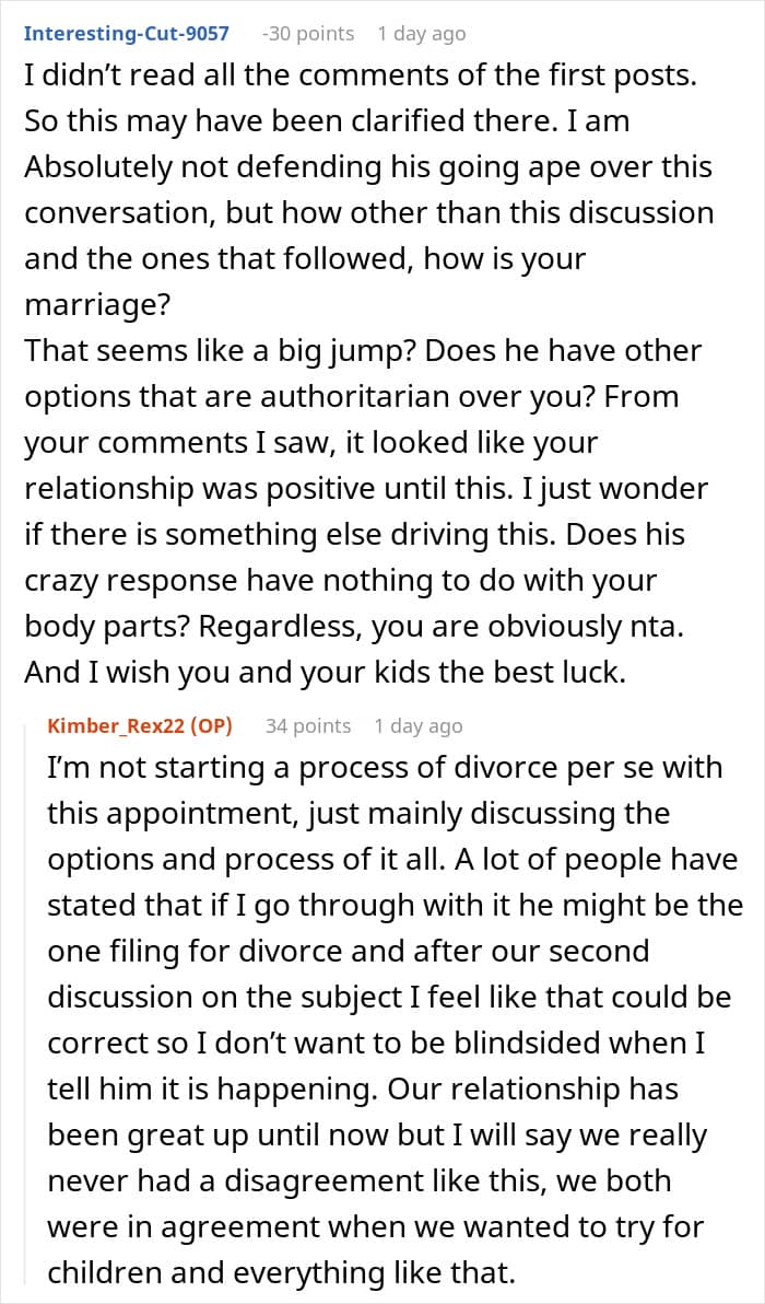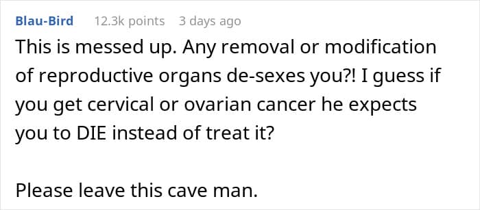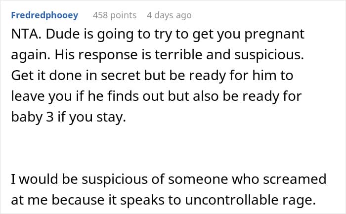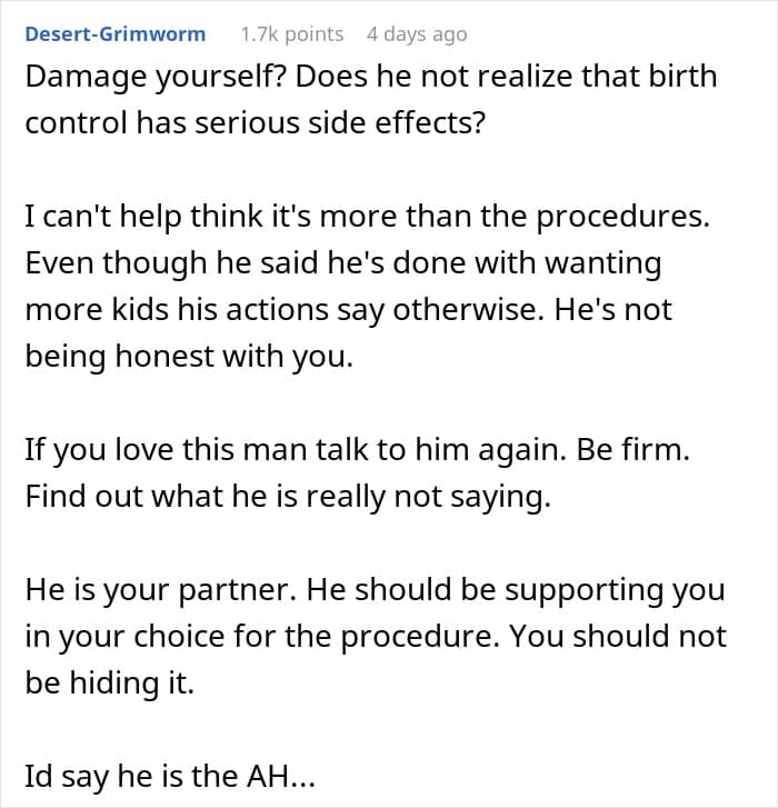 Since this woman had debilitating reactions to birth control and didn’t trust other methods, she thought that sterilization (either for her or her husband) would be perfect for their family. What she didn’t expect was that her husband would strongly object, forbidding her from going through with it.