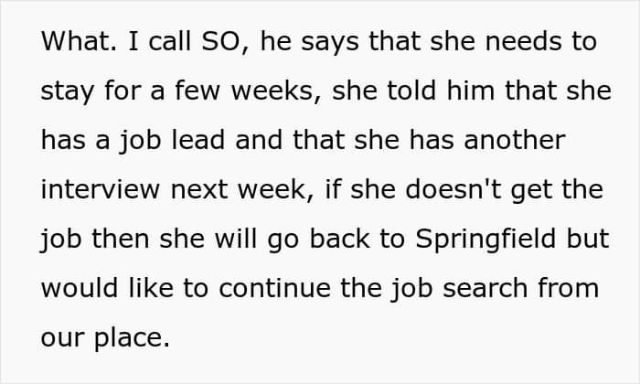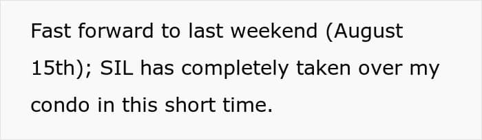 The sister-in-law then proceeded to take over the couple’s condo, camping out in their living room, eating all their food, and getting loudly intimate with a random guy