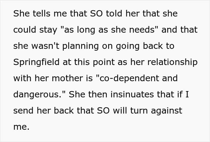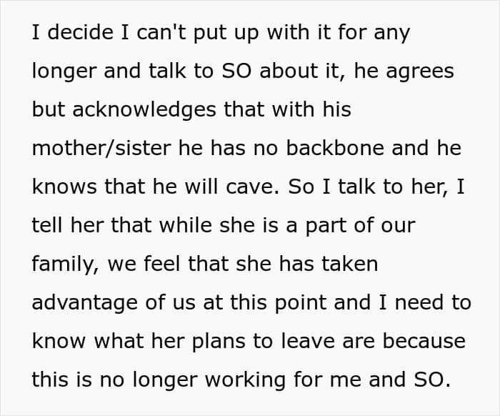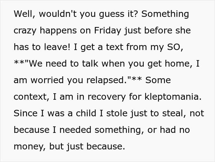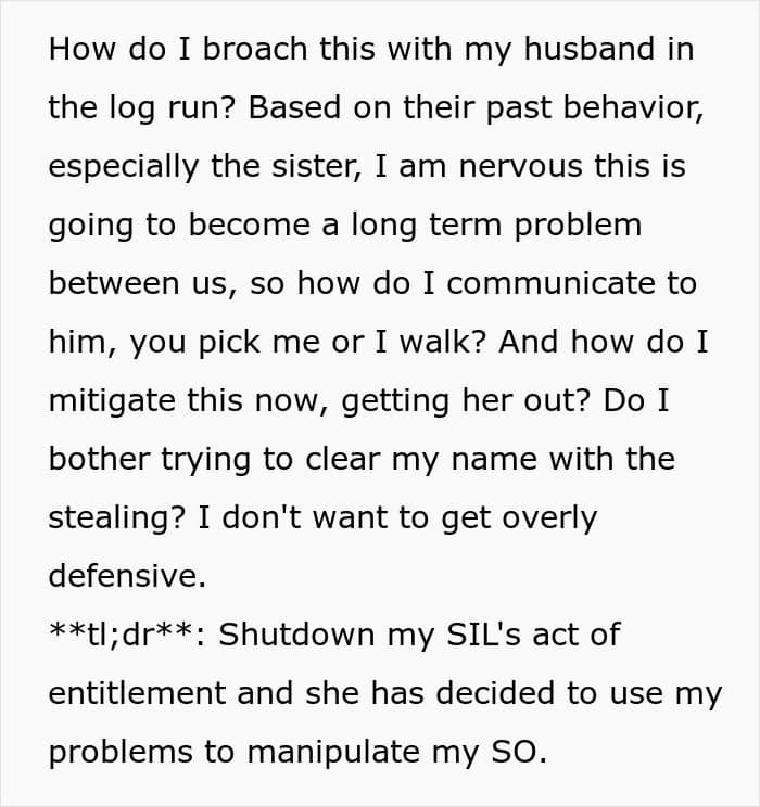 When she decided to speak up, her sister-in-law dropped a bombshell: she wasn’t planning on leaving at all. And worse? She insinuated that OP was a manipulative threat to the family. Just as the couple was about to send her packing, she framed OP, accusing her of stealing her stuff and using her past kleptomania against her. Diabolical.