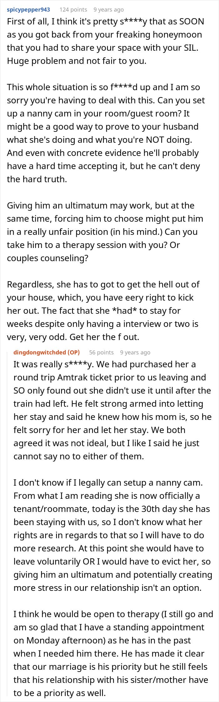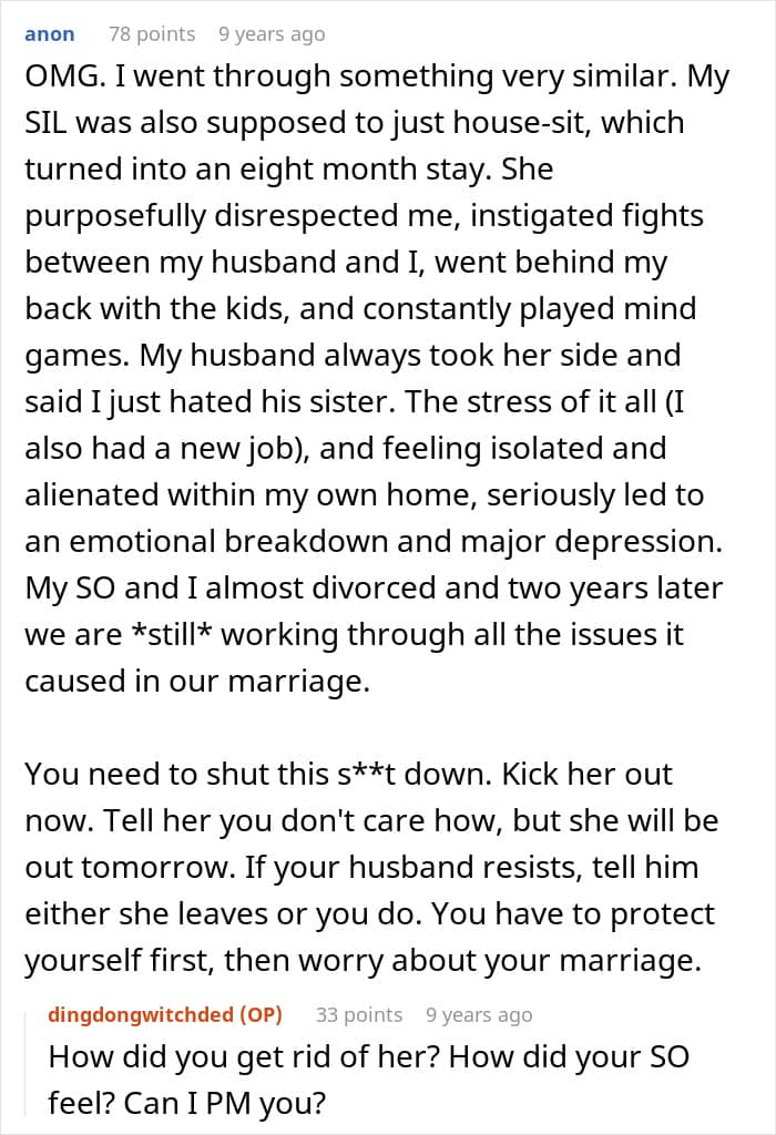 Her sister-in-law agreed to house-sit while she and her husband were on honeymoon, but ended up overstaying her welcome by manipulating her brother