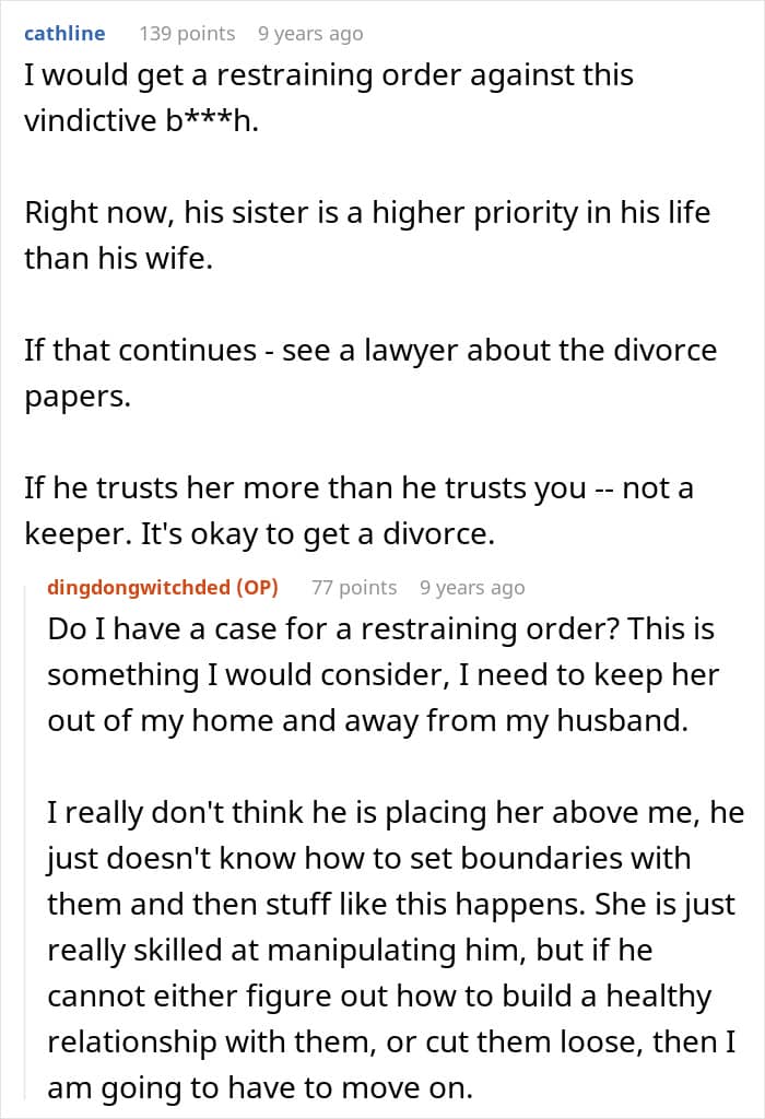 In the comments, readers pushed for the woman to give her hopeless husband the ultimatum and send her conniving sister-in-law packing as soon as possible