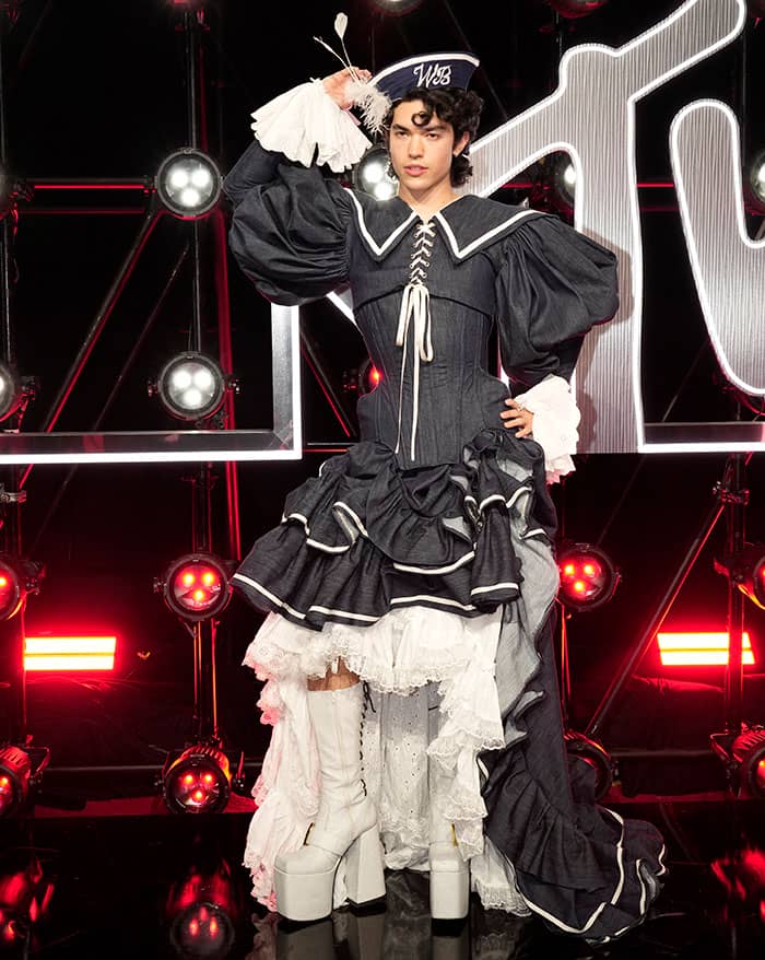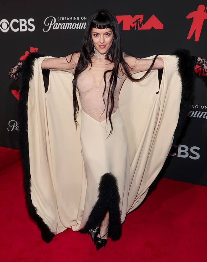 She was dressed in a voluminous black gown by Marc Jacobs from the designer’s fall 2025 collection, featuring big sleeves and floral lace embroidery. The look was topped off with a red floral headpiece and dramatic makeup.