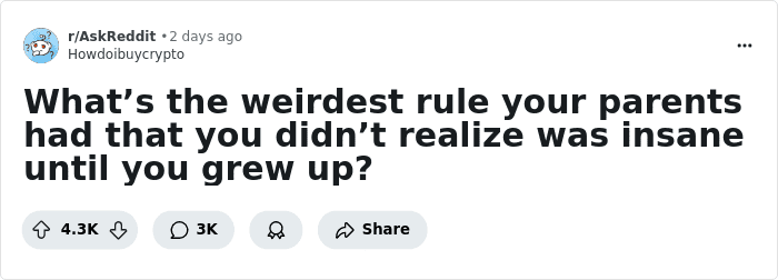 For some people, it’s unfortunately the latter. In a recent Reddit thread, they shared the weirdest, most absurd rules their parents ever imposed. Responses ranged from TV shows they couldn’t watch to questionable rituals that made absolutely no sense. The worst part is that they never realized the ridiculousness until they grew older.