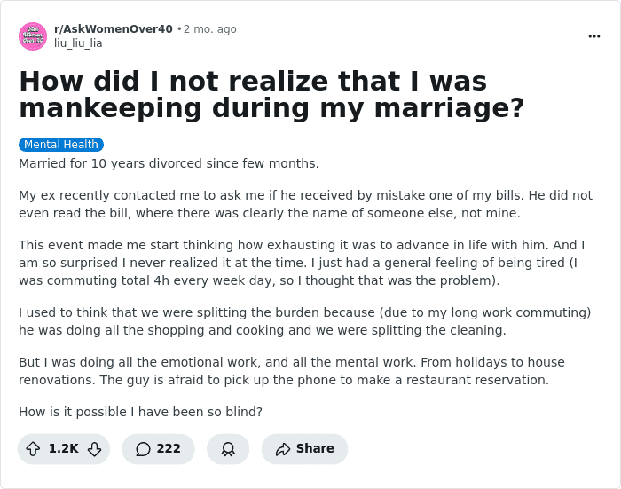 As women we’re deeply programmed to downplay and make excuses and find workarounds when we’re being overworked or things are unfair. You’ll see it all the time on this sub. Women looking for ways to power through actual issues and getting tons of advice on medical interventions and more….anything but questioning the fact that we’re doing too much and getting too little support.