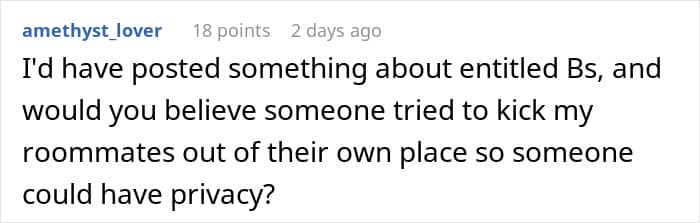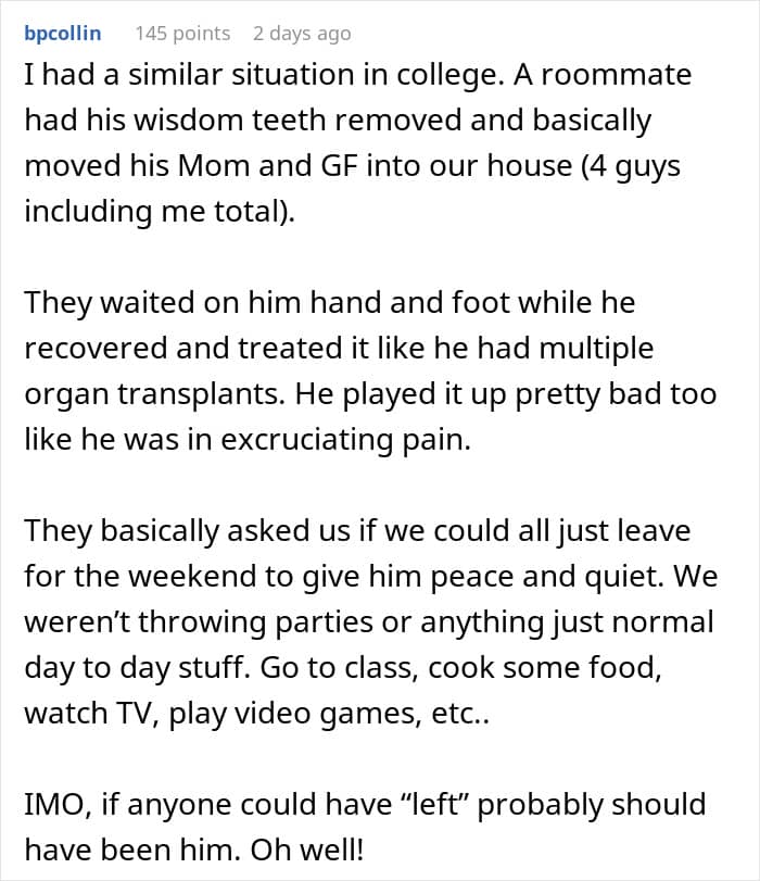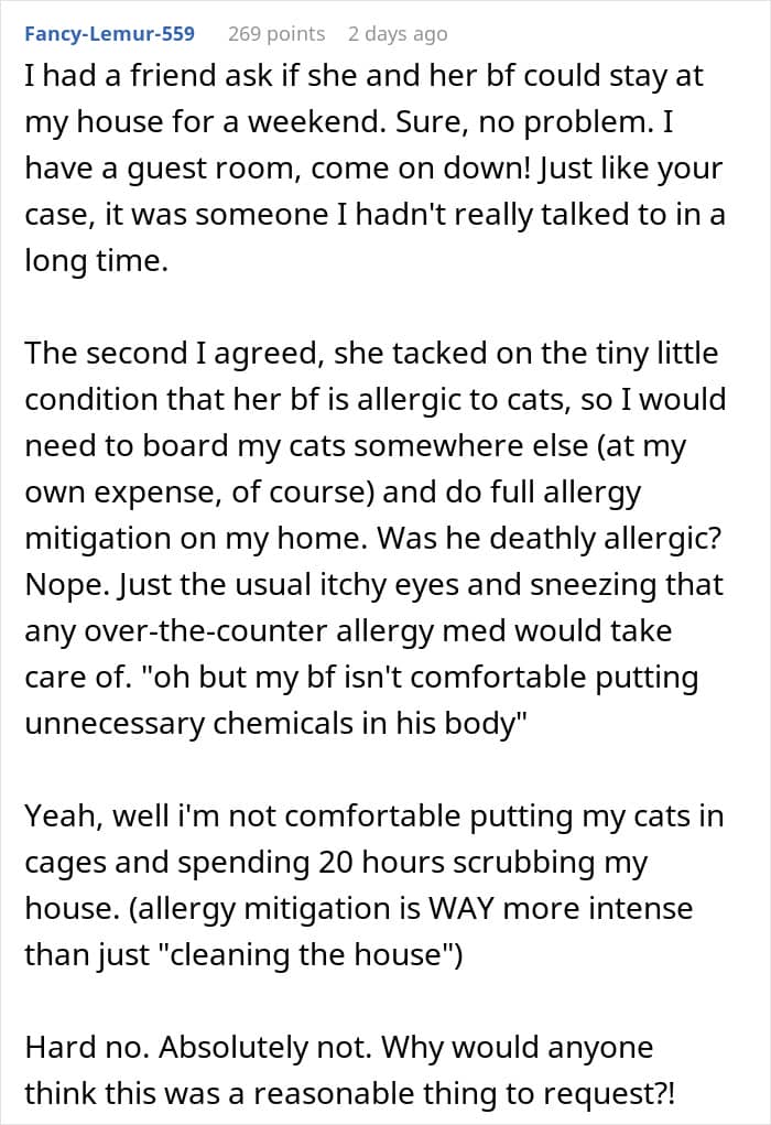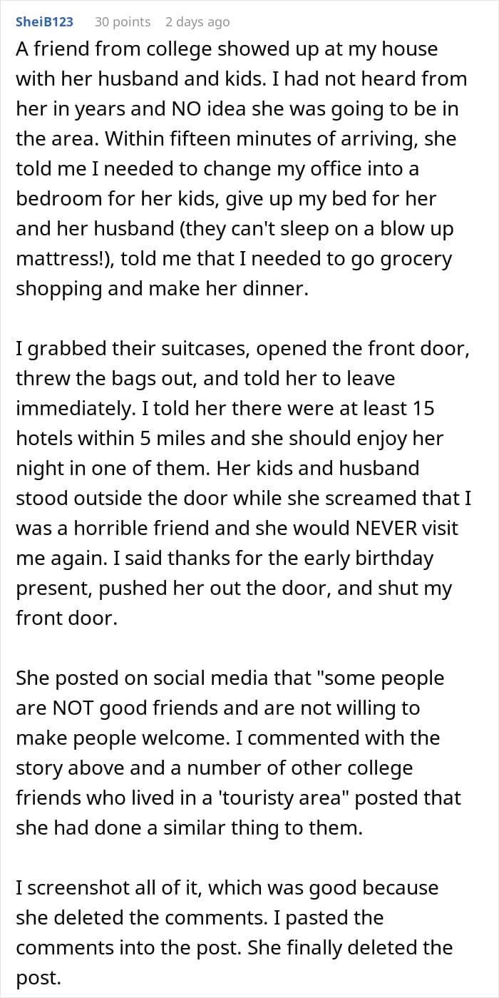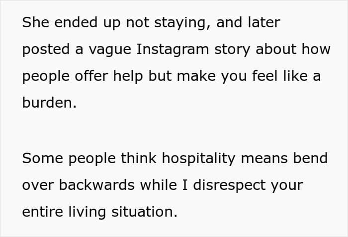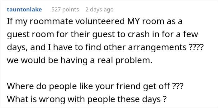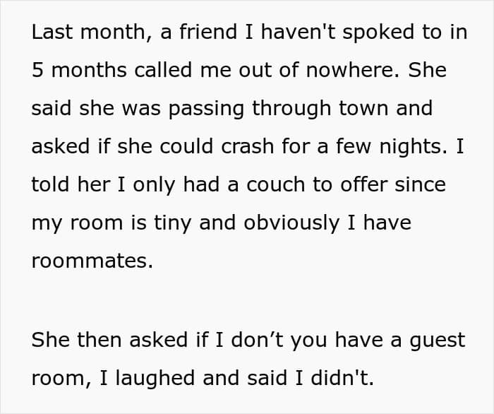 This woman wanted to stay at her friend’s for a few nights, but the couch wasn’t good enough. She expected the friend’s roommates to give up a room so she could have “more privacy” and feel more comfortable. This situation became a cautionary tale in overestimating your friend’s hospitality by expecting them to bend over backwards.
