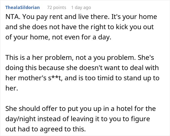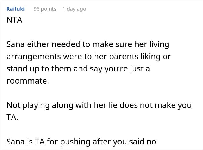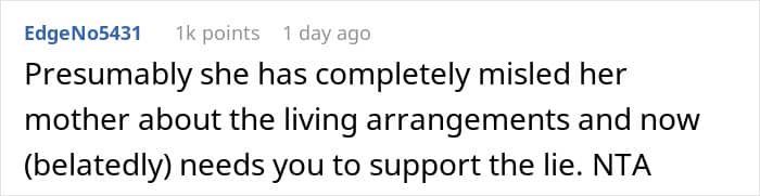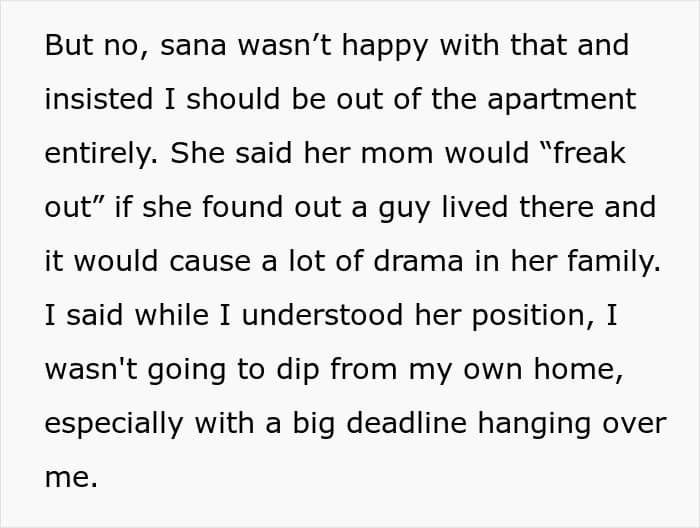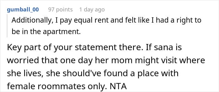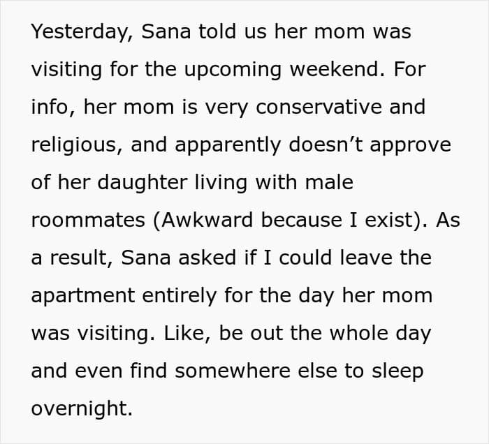 This young student had a conservative mother, and knew she would be upset to find out that her daughter is roommates with a man. To keep it from her, she asked the guy to crash somewhere else for one night during the mom’s visit. But the roommate didn’t feel that was fair, so, he decided to ask for opinions online: was he not seeing the situation clearly?