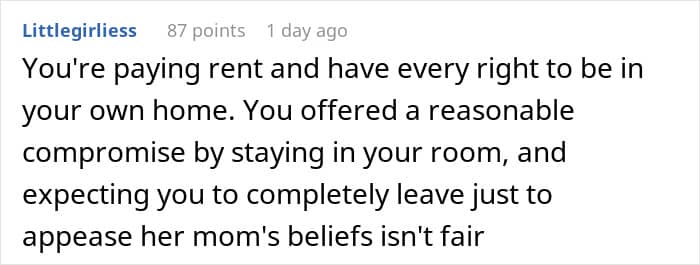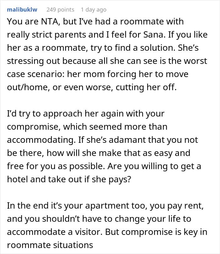 Some commenters pleaded the roommate to be understanding: “She’s trying to break away from a very controlling upbringing”