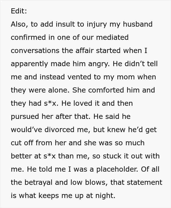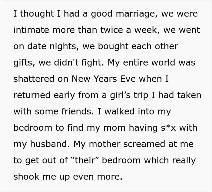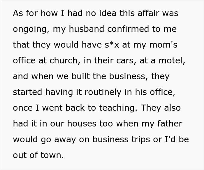 RELATED:A woman found out her mother and husband were having an affair for 22 years