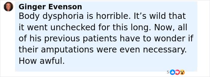 After the amputation, the once-respected surgeon was “totally overwhelmed by support from friends and family, which made it even more difficult to tell them what had really happened,” the lawyer added.