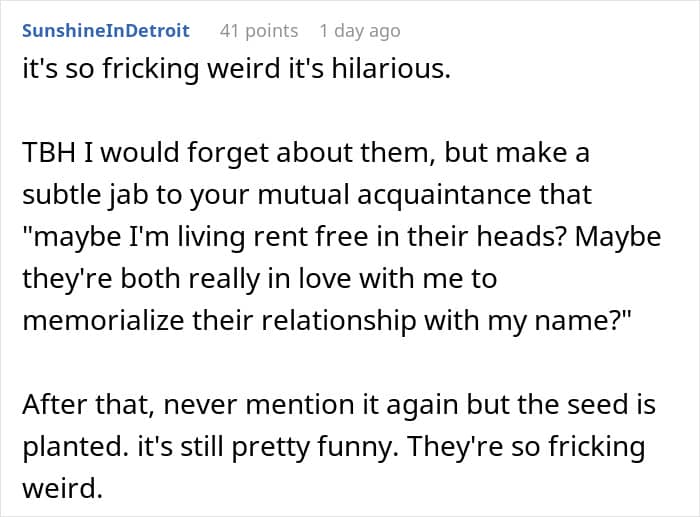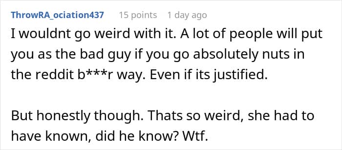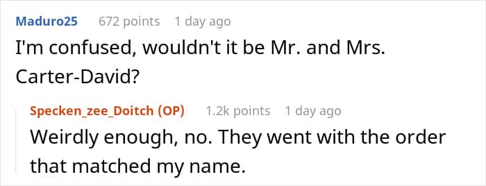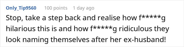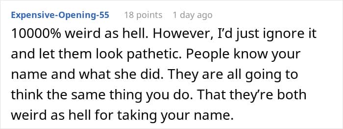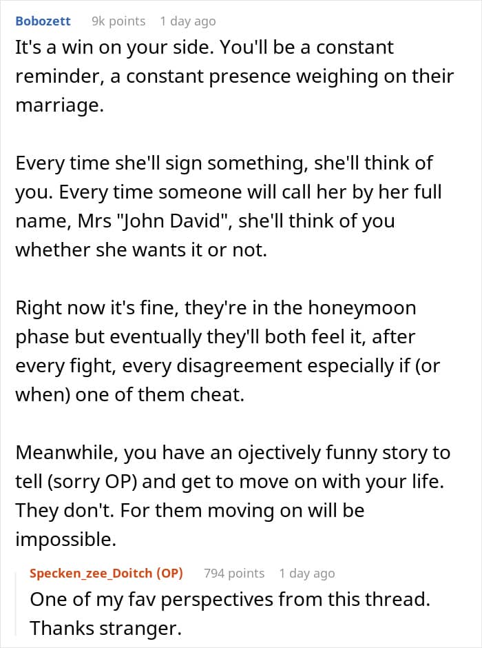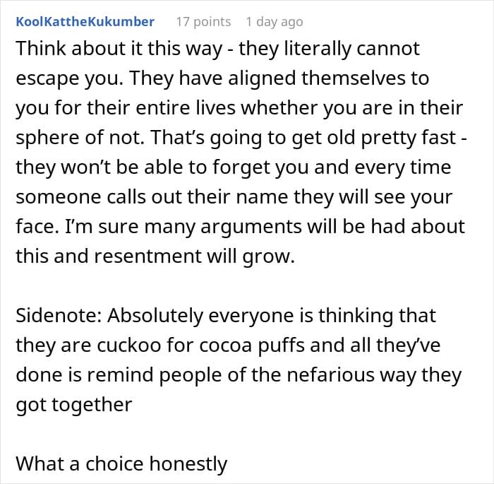 But the wife in this story went even a step further. After cheating on her husband and marrying her affair partner, she decided to keep the ex’s last name. And in a cruel twist of fate, her new beau’s last name was the same as her ex’s first name. So, when both hyphenated their last names after the wedding, they became Mr. and Mrs. Ex’s Legal Name.