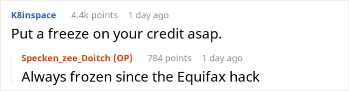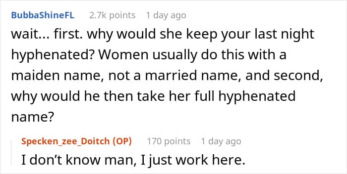 However, there’s one potential downside, which some commenters already alluded to: protecting their credit rating. When both exes have the same last name, they can take out joint credit agreements under the “family” name.