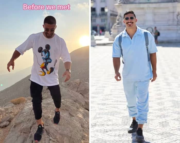 From baggy jeans and ratty T-shirts to crisp shirts, stylish sneakers, and a haircut that actually suits him: the glow-up is real. And these “before he met me vs. now” pics definitely don’t disappoint. It’s proof that love really can change a man, one shopping trip at a time. Keep scrolling and see how a little love (and maybe a few strong opinions) can turn a style disaster into a fashion king!