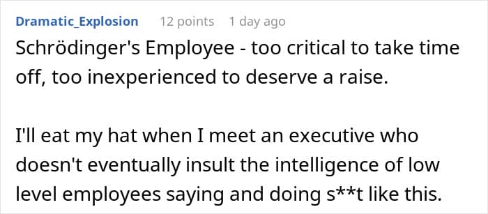 Building on Ryan’s ideas, we could assume that since the Redditor knew much better than their boss how much it would cost the company (and management personally) for them to leave, their primary mission should not have been to teach the superiors a life lesson but to grow their own flame. After all, they already knew that the boss was a snake who didn’t deserve their talents.