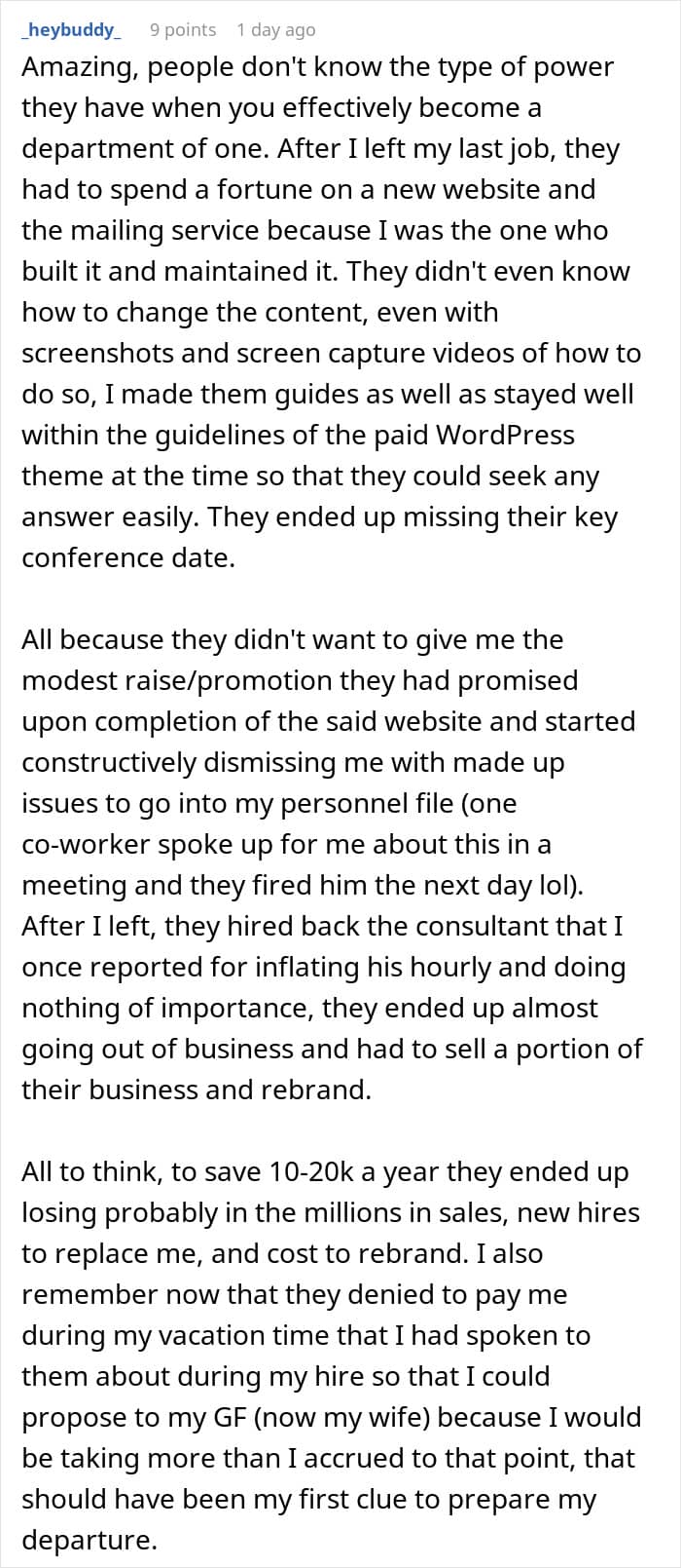 After leaving the company, the Redditor invested time in themselves, and it paid off. “I have been working on myself while looking for my next gig, and I got one about a month after my last day at the media company.”