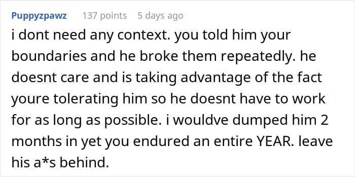 Internet user u/Artistic_Answer94 vented on the ‘Am I Overreacting’ online forum about the parasitic relationship between her and her boyfriend. She revealed how she finally snapped and called out her unemployed partner for refusing to look for a job or help out around the house, while she’s funding his slob lifestyle.
