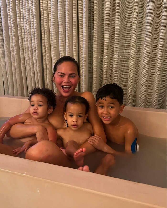 Chrissy Teigen, known for sharing bath time moments with her children, recently faced criticism for a photo featuring her with son Miles, six, daughter Esti, two, and 20-month-old son Wren in the tub. This latest instance prompted online users to express discomfort, with some deeming Miles “a little too old to be having a bath with his mom.” Negative comments included descriptions like “abnormal” and “cringe,” highlighting concerns about the children’s privacy and age appropriateness.