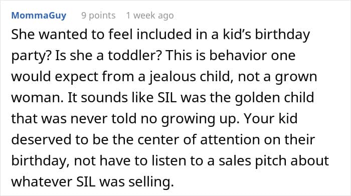 Commenters overwhelmingly sided with the mom, arguing that the sister-in-law’s behavior was laughably inappropriate for a child’s birthday party. The mother-in-law’s excuse that the SIL “just wanted to feel included” was particularly shredded. As one responder aptly put it, “She wanted to feel included in a kid’s birthday party? Is she a toddler? This is behavior one would expect from a jealous child, not a grown woman.”
