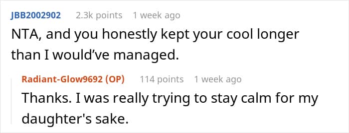 Thoroughly dethroned, the SIL made a quiet and early exit. Soon after, the mom received a call from her MIL, who claimed she had “embarrassed” the SIL and should have just let her speak. Even her husband took a neutral stance, admitting that while the SIL was out of line, his wife’s takedown was “a little harsh.” Now, she’s left wondering if she was wrong for protecting her daughter’s spotlight from a scene-stealing relative.