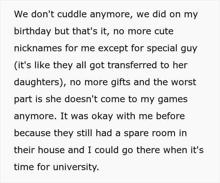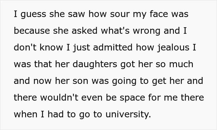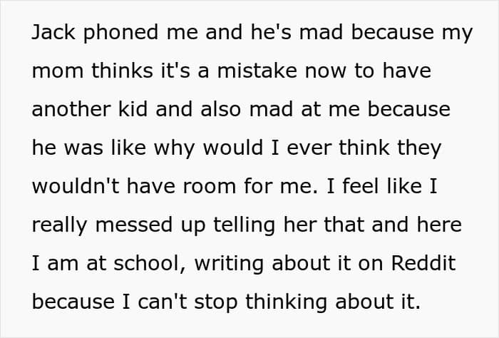 He told her how he feels jealous of his half-siblings because they always have her around, and now they won’t even have space for him with them when he wants to go to university. The woman started crying and she was inconsolable. In fact, she even started questioning whether to have this kid, and the whole family just lashed out against the poster, who’s feeling guilty about it.
