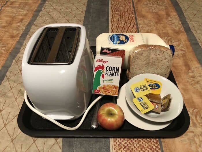 #41 A Motel Served Me This Breakfast Tray For $15 And Contains A Toaster, And A 2l Milk