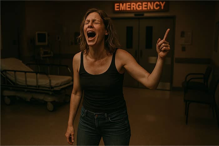 So like most rational upset people, she took off all her clothes and was screaming at the top of her lungs about how the doctors were f****d up. She’s stomping around the ward just starkers. Naked screaming lady isn’t a thing sick kids should be seeing, so security came and took her into an isolation room (that’s used for bad psych cases). Whenever someone approached the observation window, she’d spread her legs, point at her vag and go, “What do you think of this?”