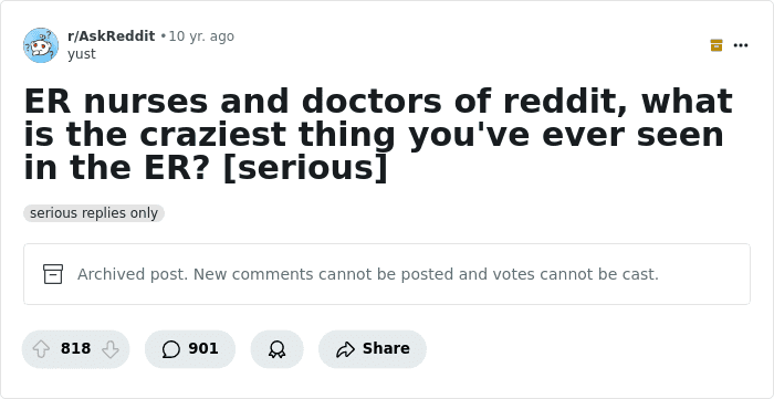 One night he came home and told me a thief had broken into someone’s house that night and was bent over, rummaging through the homeowners belongings. The homeowner was 5 feet away in a closet with a cross bow… They had to carry the thief into the ER because the homeowner shot him square in the a**s. My dad said he’d never been so mortified of a wound until he saw that.