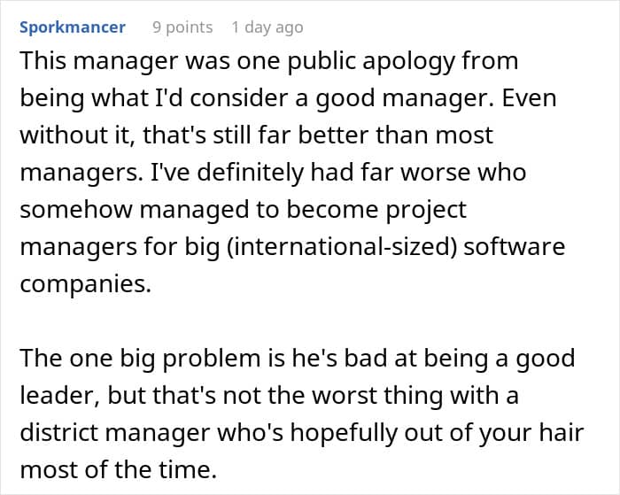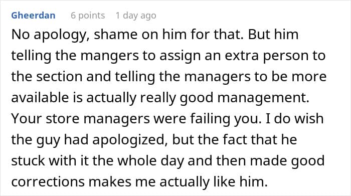 Meanwhile, they were happy to share their thoughts on what good management actually looks like. “A great manager needs to listen to their staff, and be willing to pitch in and work on the floor, in the warehouse, wherever it is needed. Anything they’re asking staff to do, they should also be willing to do,” u/Theory_Large said.