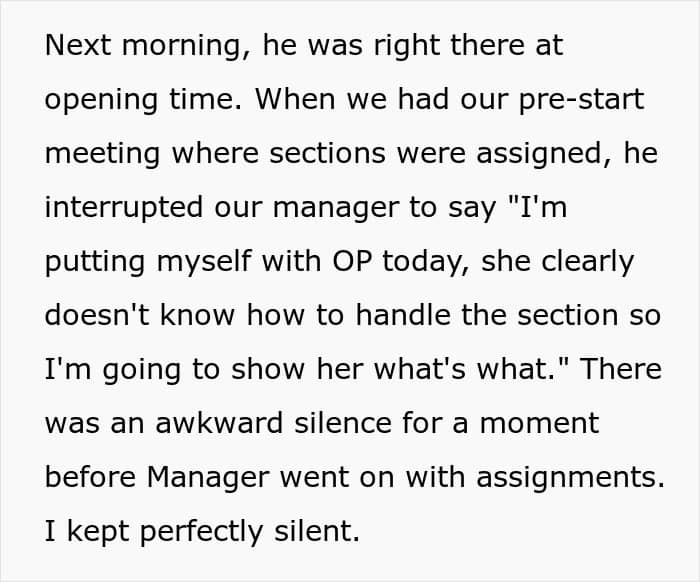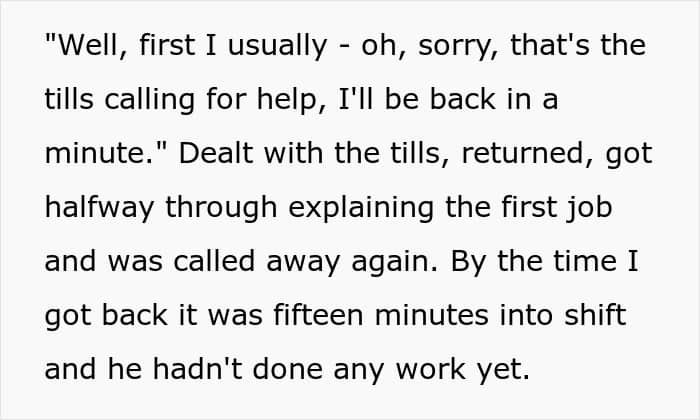 “He saw a messy section I was in charge of and assumed I just wasn’t bothering. Earlier in my time there, I was assigned to a section with a till, and he used to complain that the shelves were messy when I was literally on the till my whole shift. I don’t think he was malicious, exactly; he just got these ideas and never looked past them,” they said.