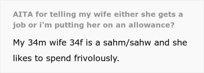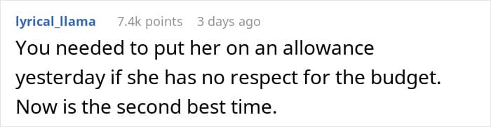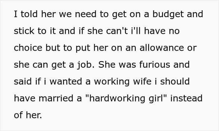 So, the man decided to tell her that she needs to go on a budget and stick to it, as the current situation with her spending bugs her. If she won’t comply with it, she’ll have to either go on an allowance from him or get a job.
