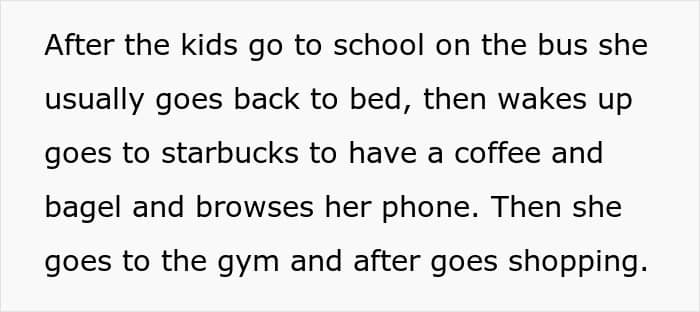 In the case of today’s story, the kids already go to school, which opens up a little more opportunity for her to have some time for herself. After kids are dropped off at school, she goes back to bed, then to Starbucks for a coffee, the gym, and shopping.