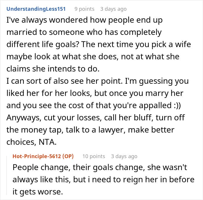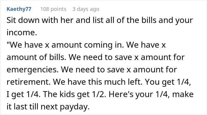 Many netizens agreed that the woman should either get employed or go on allowance, as it would teach her to be less selfish