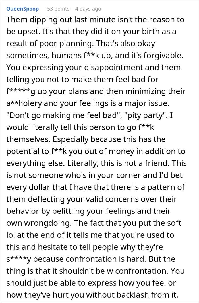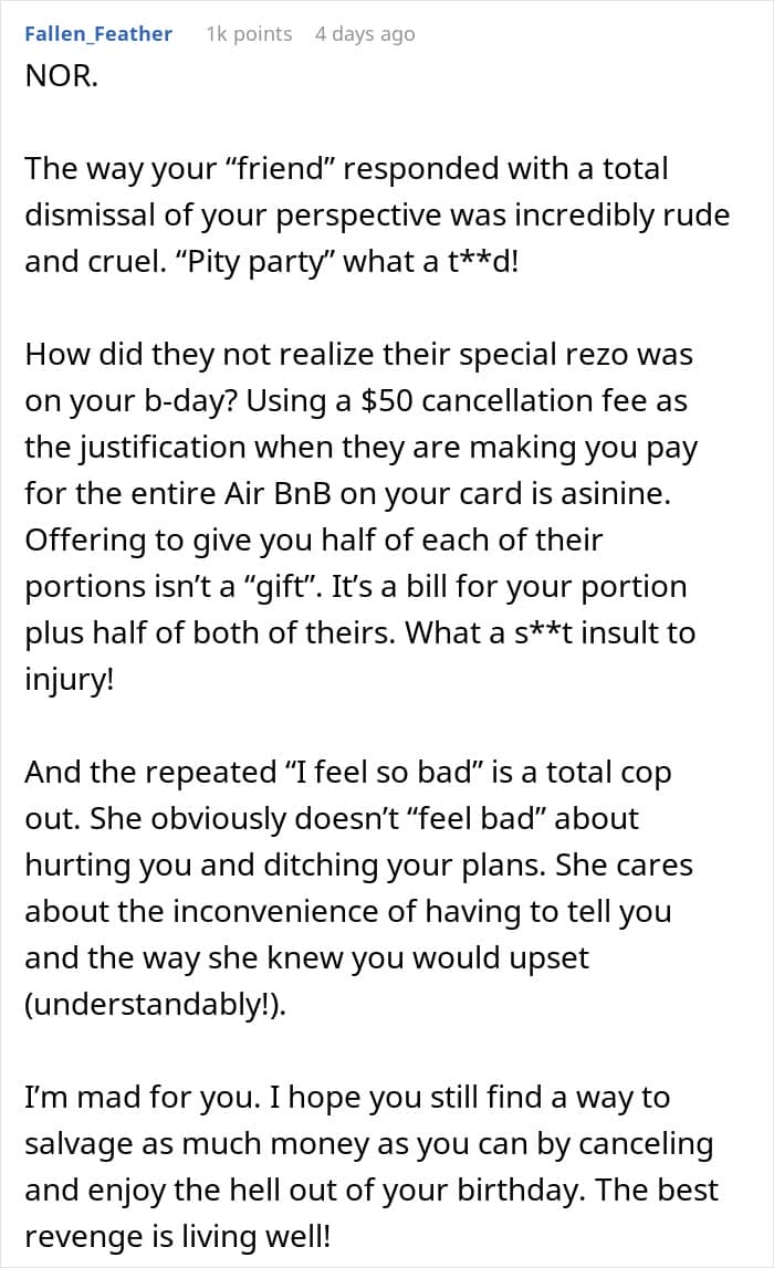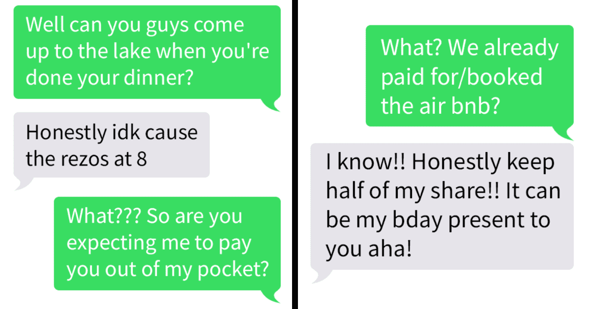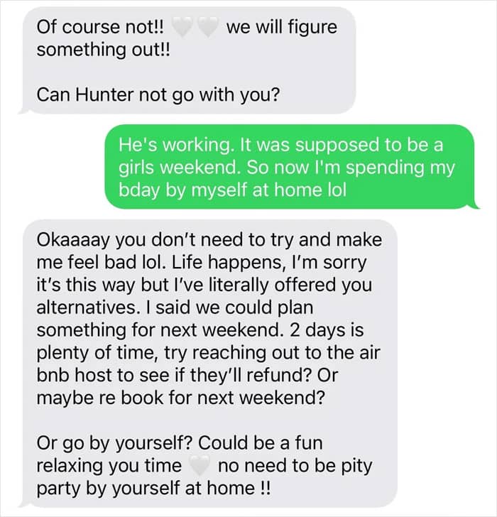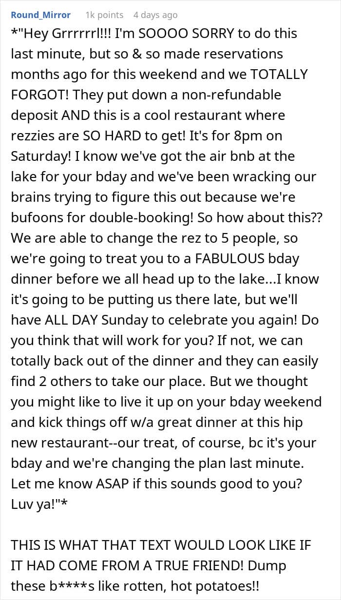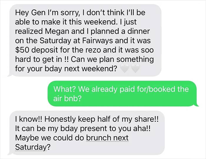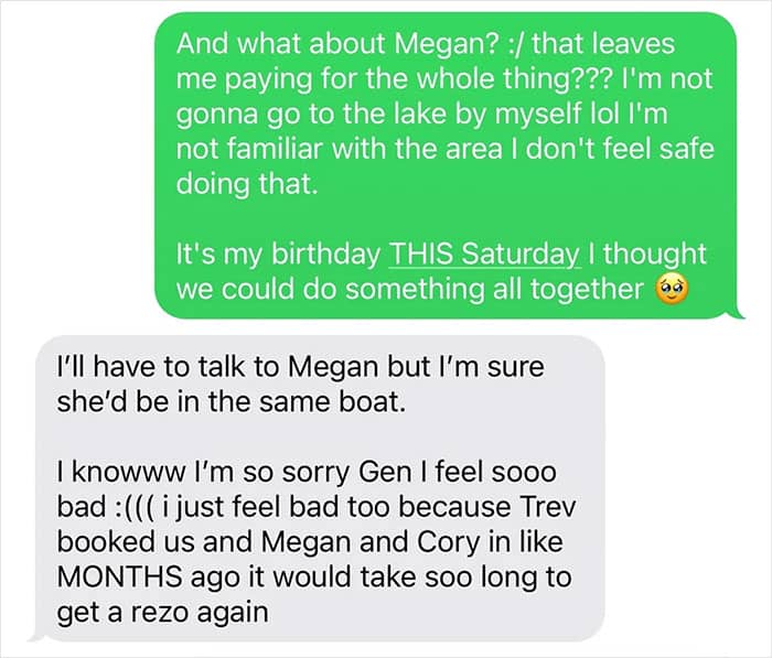 So one woman was understandably annoyed when her friends texted her that they couldn’t make it to her birthday