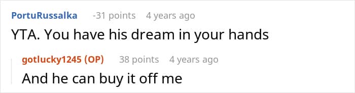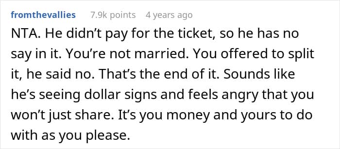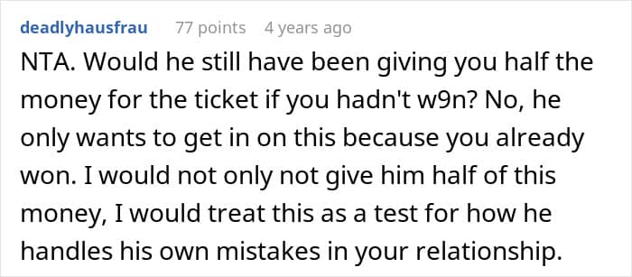And wouldn’t you know it? She won. Now, he’s furious that she won’t share the prize he passed up the chance to get.